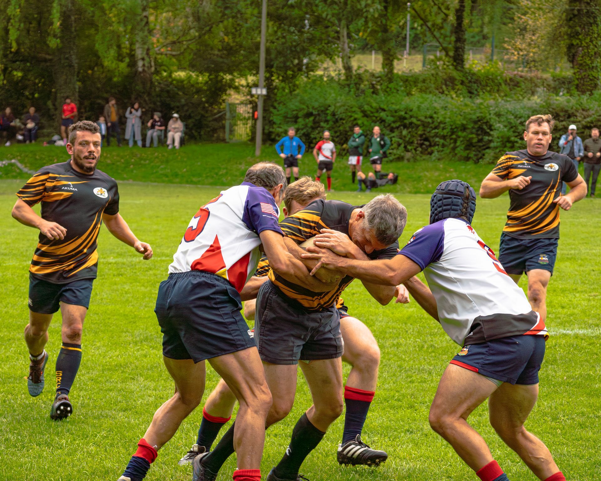 The next day, the event kicked off with a fiercely contested Old Boys match, featuring veteran players from Bodensee United — a regional selection uniting Konstanz, St. Gallen, Tägerwilen, and Freiburg — facing the American tourists from Boulder. Despite the players’ years of experience — some well into their seventies — the game was played under full regulation rules, meaning real rugby with real tackles. The crowd loved it: physical, honest, and full of respect, it was proof that the rugby spirit never fades with age.